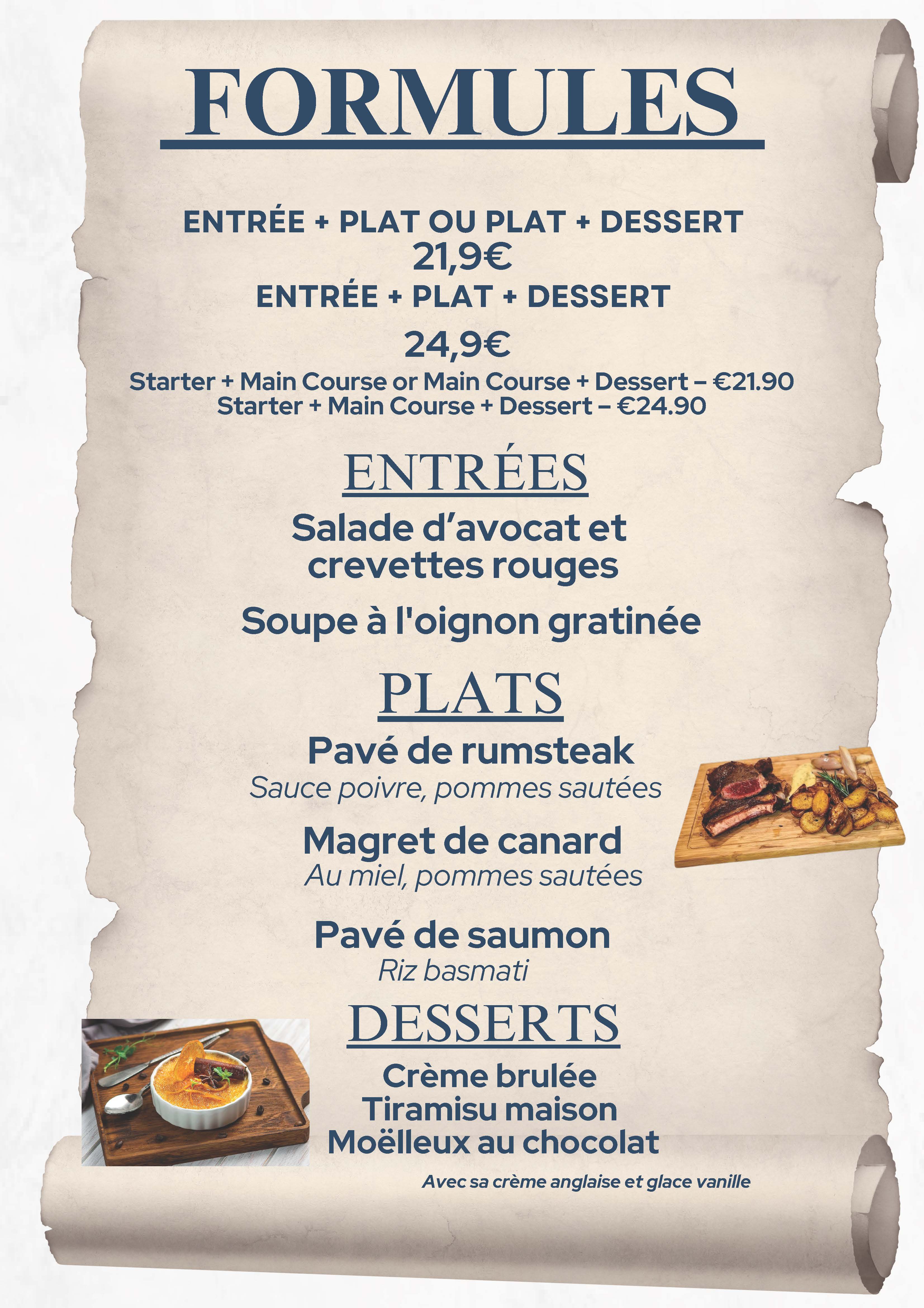 Que vous soyez amateur d'entrées délicieuses, de salades croquantes, de burgers juteux, ou de nos fameuses pâtes et pizzas faites maison, il y en a pour tous les goûts ! Nos plats de viande et de poisson, comme l'entrecôte tendre ou le saumon fraîchement pêché, sont préparés avec soin pour satisfaire toutes vos envies. Et n'oubliez pas de terminer votre repas sur une note sucrée avec nos desserts maison, qui ajoutent une touche douce et gourmande à votre expérience.